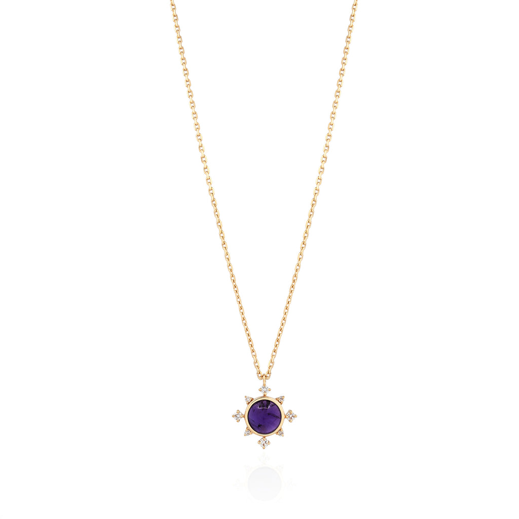 18K SOLID GOLD NECKLACE WITH 6MM AMETHYST HIGHLIGHTED WITH DIAMONDS ON DIAMOND CUT CHAIN.