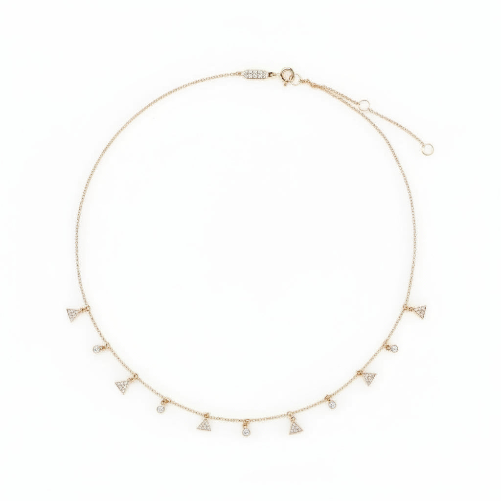 18K SOLID GOLD NECKLACE WITH PAVE TRIANGLE & DIAMOND CHARMS.